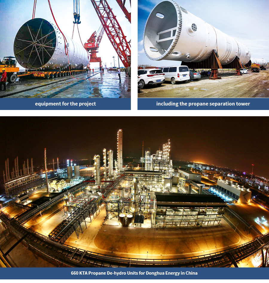 HLHI has supplied three large pieces of equipment for the project, including the propane separation tower, the propane separation tower and the de-ethane gas stripping tower for the propane dehydrogenation (PDH) units, among which the largest propane separation tower has a diameter of 10 meters, a length of 108 meters and a weight of 1400 tons.